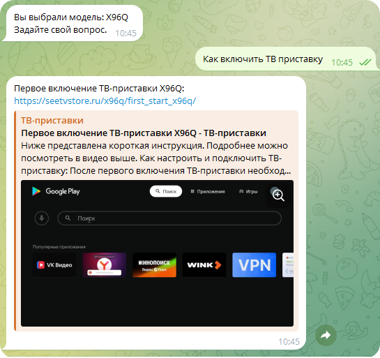 Телеграм бот SeeTV — это ваш помощник в поиске нужного ответа по нашим ТВ-приставкам, который доступен в любое время суток.